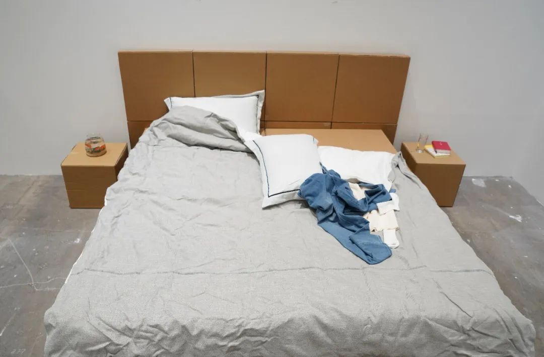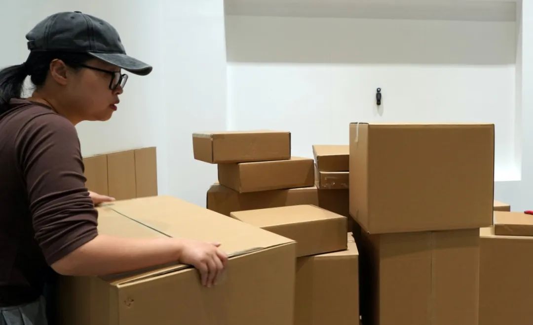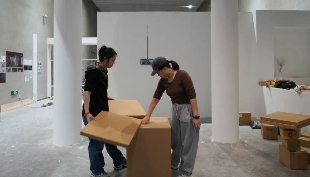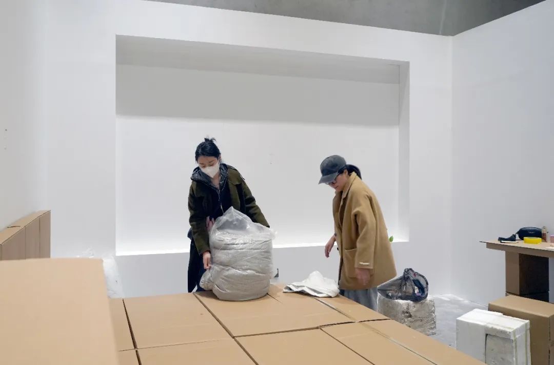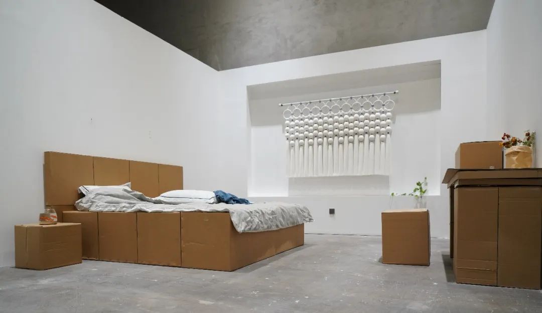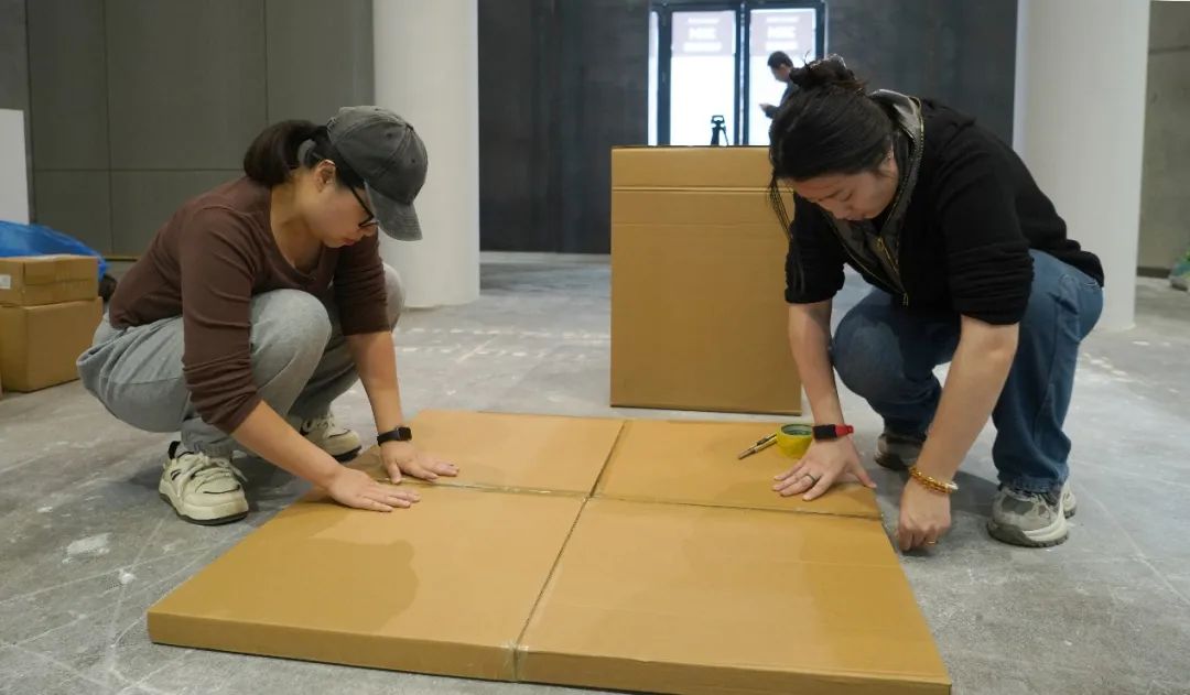 崔译文+贺婧贤组合展“家”布展现场(左:崔译文,右:贺婧贤) 2024年11月15日对于那些在外某生的年轻人来说,城市中的“家”,是一个没有归属感的暂时栖身之所。漂泊不定的生活让她们不会对暂时居所作长远的投入。因此,她们在美术馆里用纸箱、快递包装这些“消费主义”残留的躯壳,搭建成床和家具。纸箱这种日常材料,其易变性和可塑性在两位设计师手中得到了充分的发挥。她们认为纸箱的脆弱性象征着年轻一代面对生活挑战时的不确定性。正如纸箱可以被轻易地撕裂或压扁一样,年轻人的生活状态也常常受到外界环境的影响而发生改变。然而,这种脆弱性并非全然消极,它同时也代表着一种适应力和灵活性。通过将纸箱进行拆解、重组和再创造,暗含着年轻一代如何在逆境中寻找新的可能性。纸箱被重新拼接的再造过程,不仅体现了纸箱的可塑性,更象征了年轻人在面对困境时所展现出的韧性。他们能够从看似无用的碎片中找到价值,并将其转化为具有新功能和意义的整体。