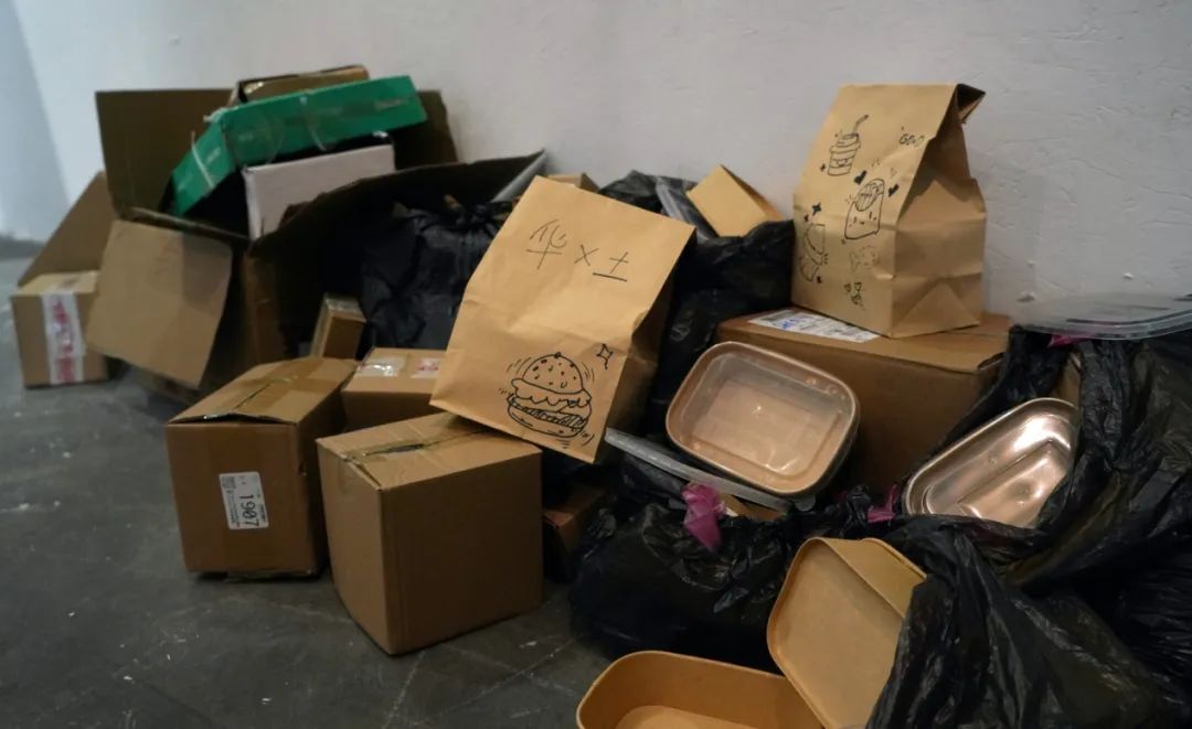 崔译文、贺靖贤组合作品《家》,作品材料:纸箱、旧快递箱、牛皮纸袋、垃圾袋、日常生活用品等,尺寸可变,2024—2025年