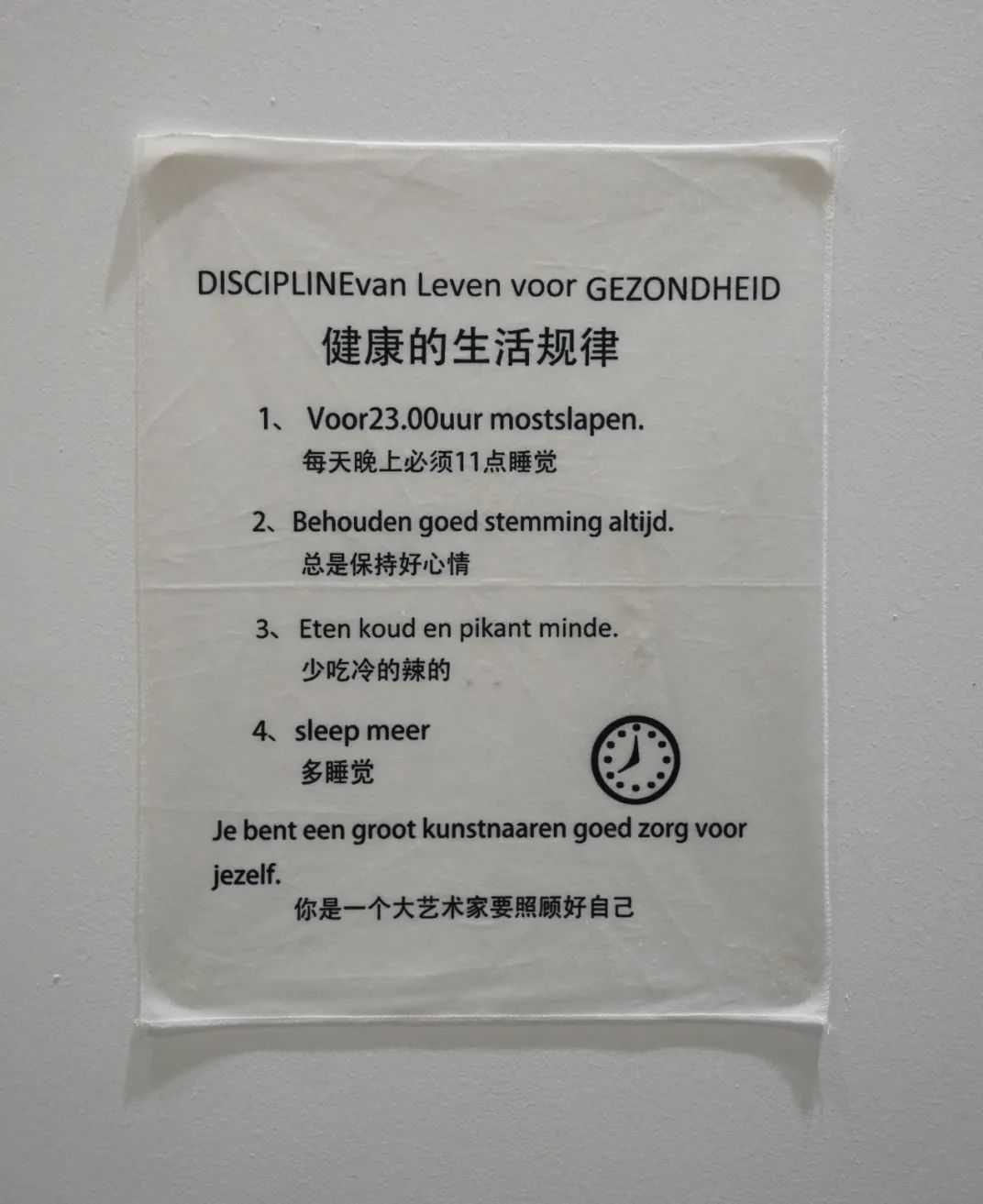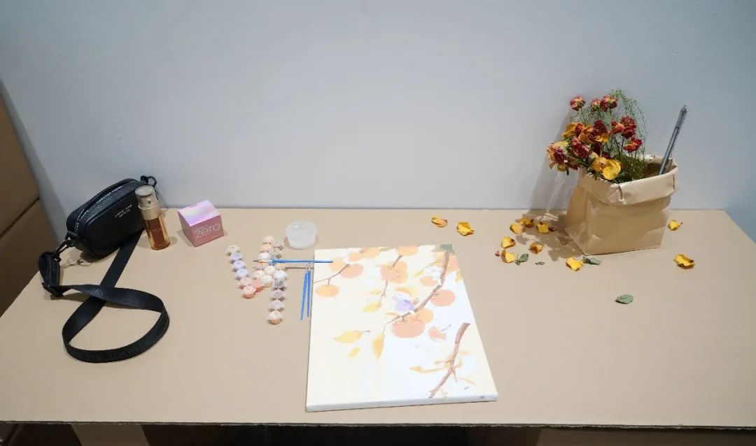 崔译文+贺婧贤组合展“家”布展现场 2024年11月15日她们在本次展览中添加了很多的“彩蛋”和她们的生活琐碎,真正的把展厅当成了“家”的概念。用尼德兰语在墙上标注对自己和生活的期许。崭新的工具书和空白的日记本摆在了未整理的床铺边。她们画了幅寓意吉祥的水彩画,却题上相反的词语。在那扇永远也打不开的窗边画了一盏灯,那是虚幻之光。纸箱做的餐桌上放着一沓送不出去出的圣诞贺卡,空白无字。她们捡拾落叶,堆满了无法注水的浴缸。这些金色的银杏叶和她们写在叶子上的祈愿,随着岁月的流逝在浴缸里枯萎、腐烂。