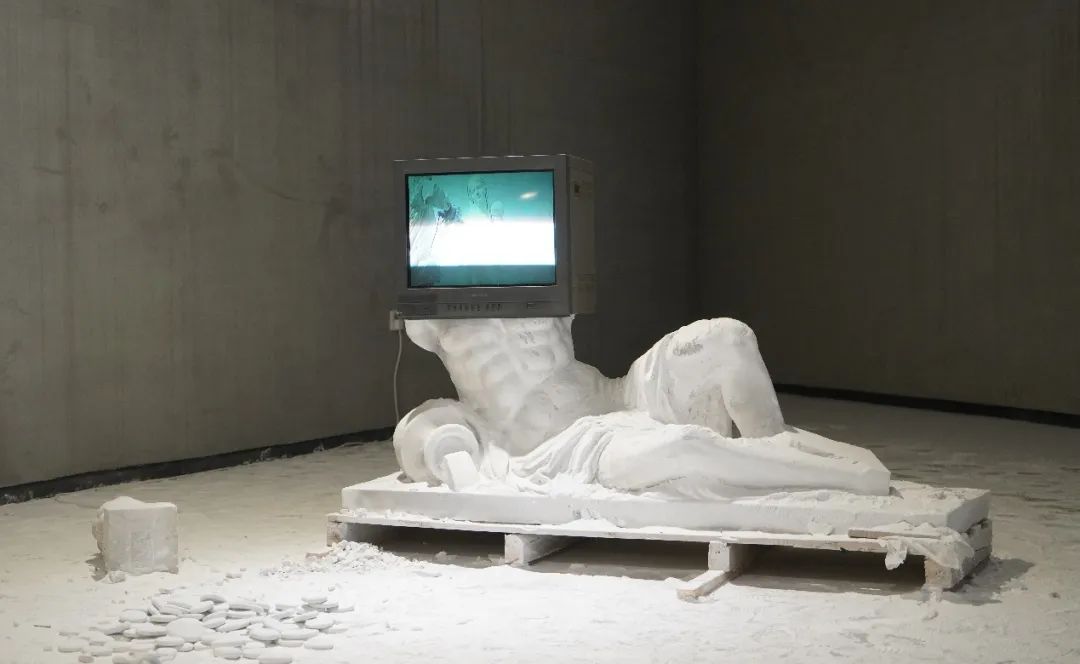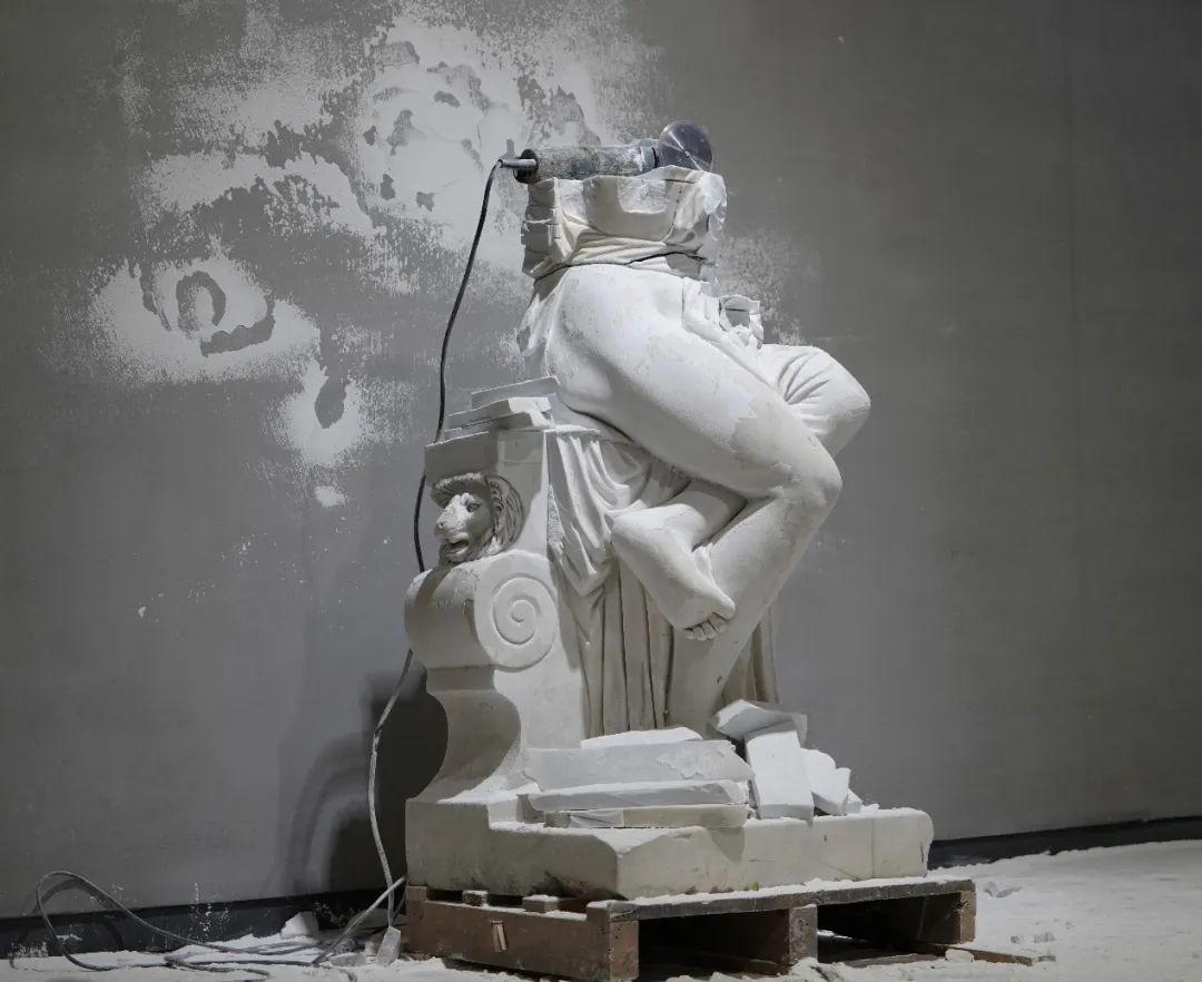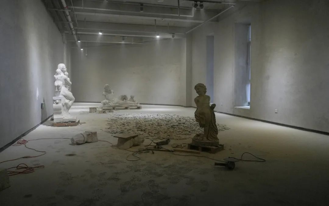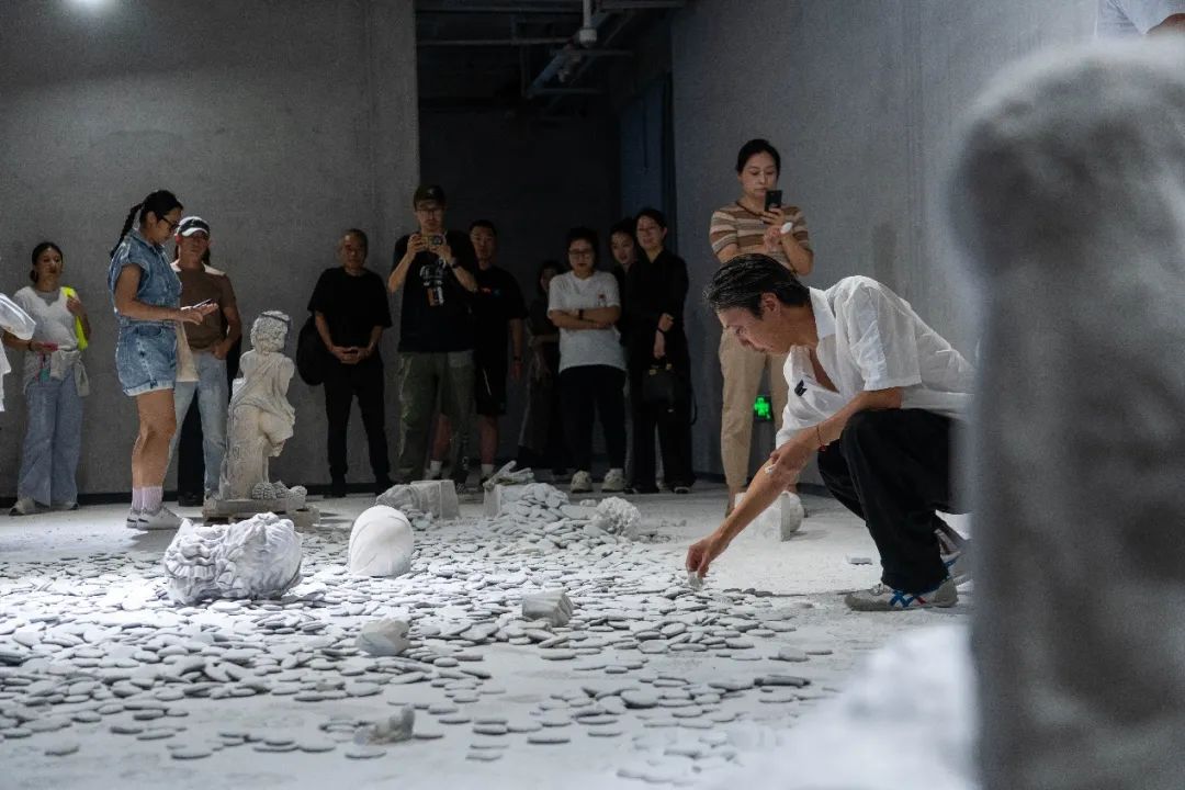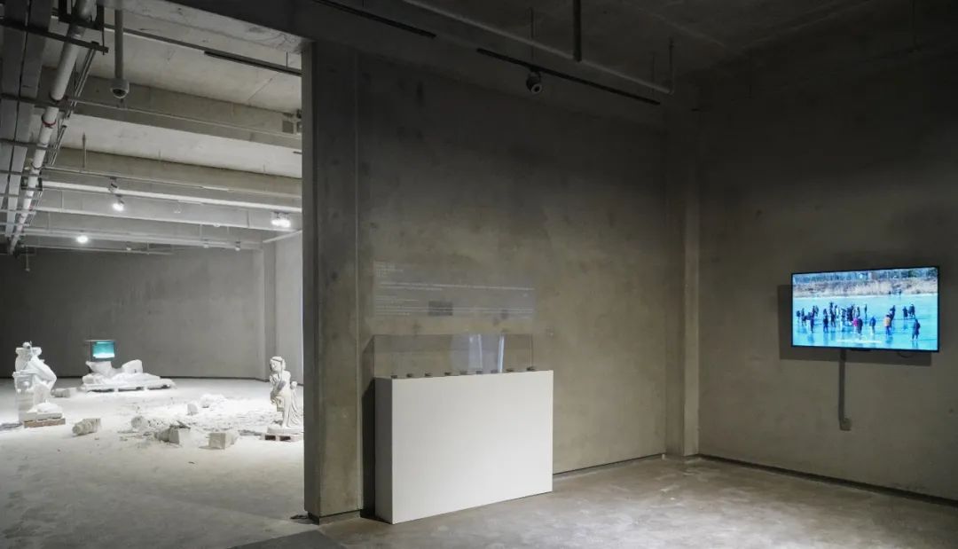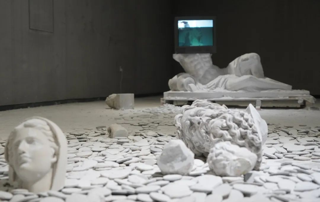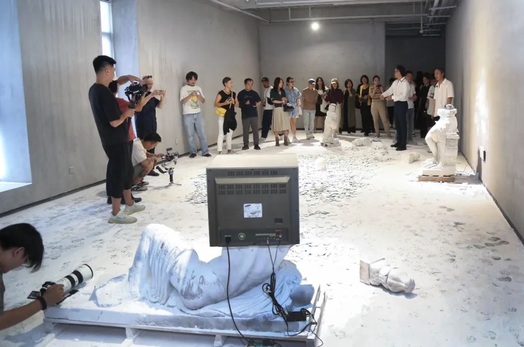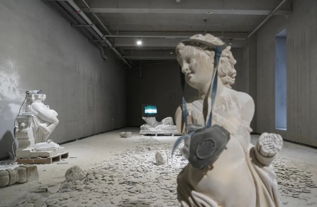 刘展作品《一串涟漪》展览现场,录像、被肢解的大理石神像、打磨大理石石片,2024年9月7日