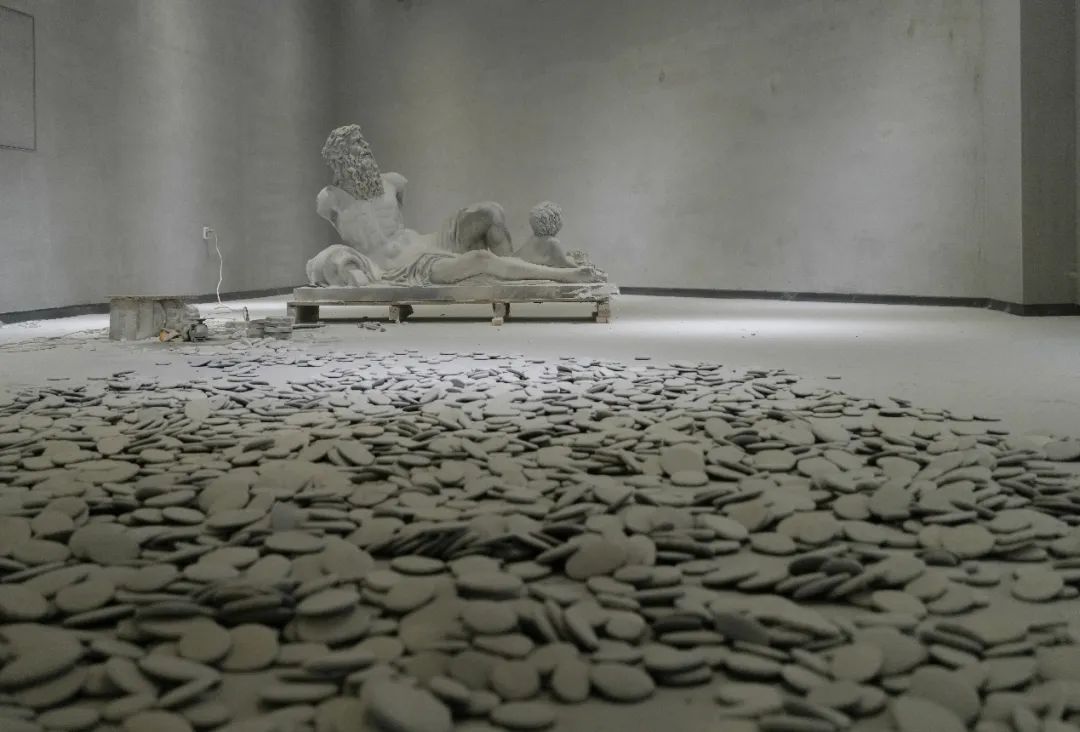 刘展用于打水漂的石片并非来自于自然界的鹅卵石,而是人工打磨制造的。他对使用何种石材、以何种方式打磨石片、在何种语境中打磨石片进行了观念性的调研。最终他选择了河北曲阳大理石雕塑厂的欧洲古典大理石雕塑作为打水漂的石材,这些大理石雕塑原来是欧洲的订件,因为欧洲经济的衰退,这些被遗弃的“欧洲诸神”在河北风吹雨淋了十余载。刘展以低廉的价格购买了足以打磨石片的雕塑,并邀请了两位曲阳的石雕师傅,在鸭绿江美术馆展厅里将“诸神”肢解、打磨成可以打水漂的石片。