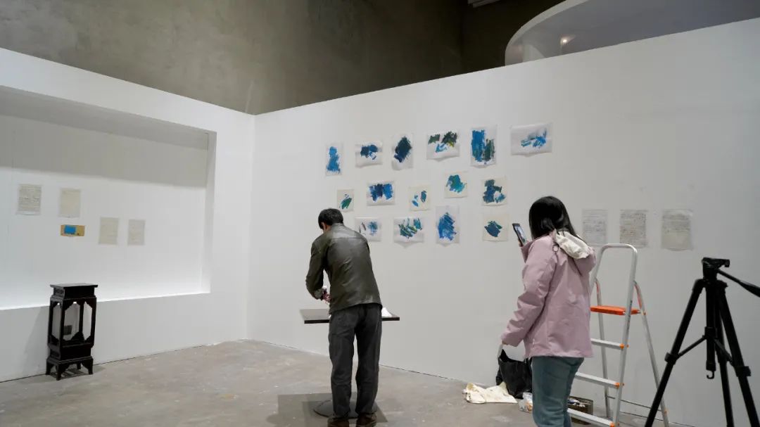 于晓威作品《如何调出普鲁士蓝》,丙烯、A4纸、复印件,尺寸可变,展览现场局部、2025年3月17日