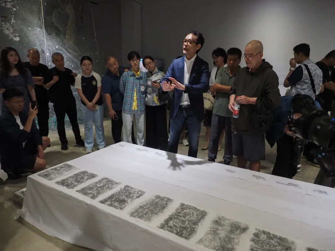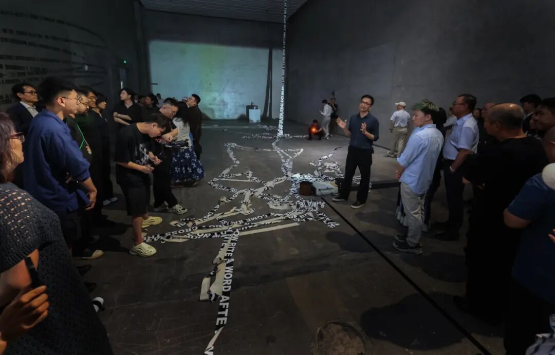 鸭绿江美术馆《复厅》展览现场,纪大海现场导览刘克雁2018年参展作品《未被校验过的生命代码》。2025.06.28