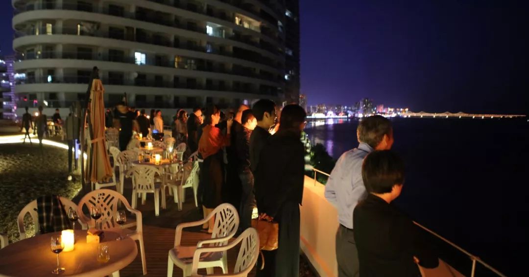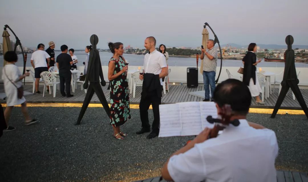 Guests look out over Sinuiju, North Korea, from the roof of the Yalu River Art Museum